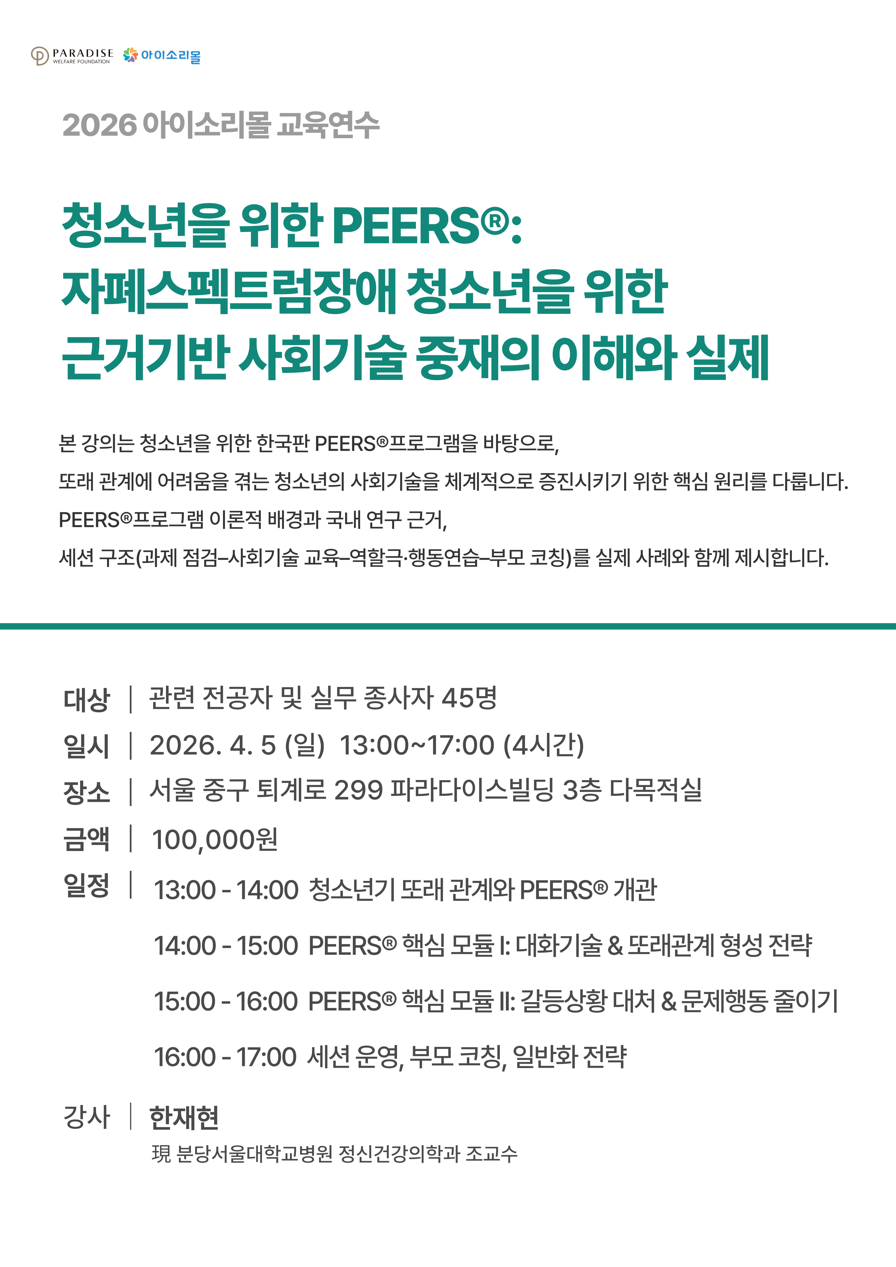 청소년을 위한 PEERS : 자폐스펙트럼장애 청소년을 위한 근거기반 사회기술 중재의 이해와 실제