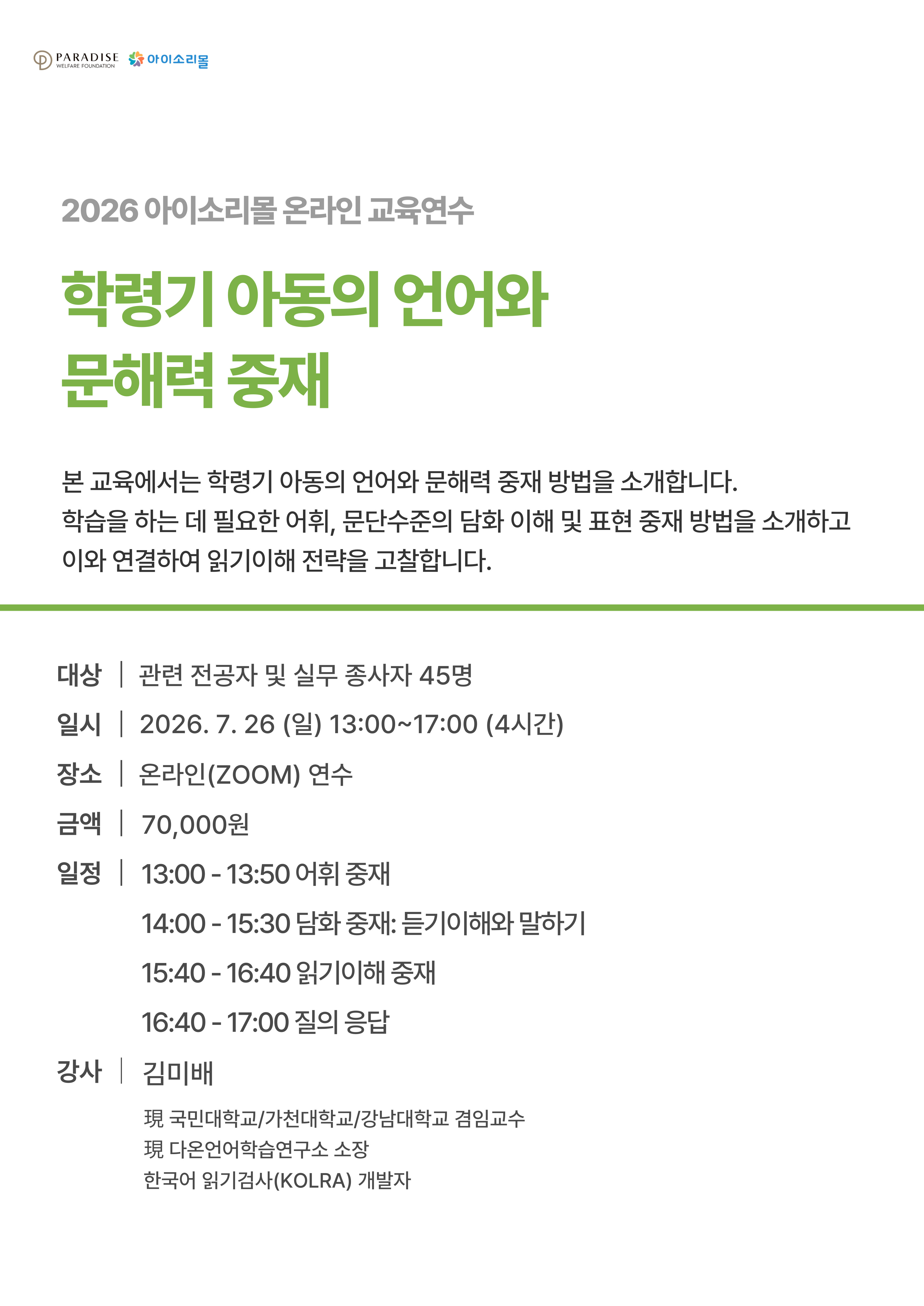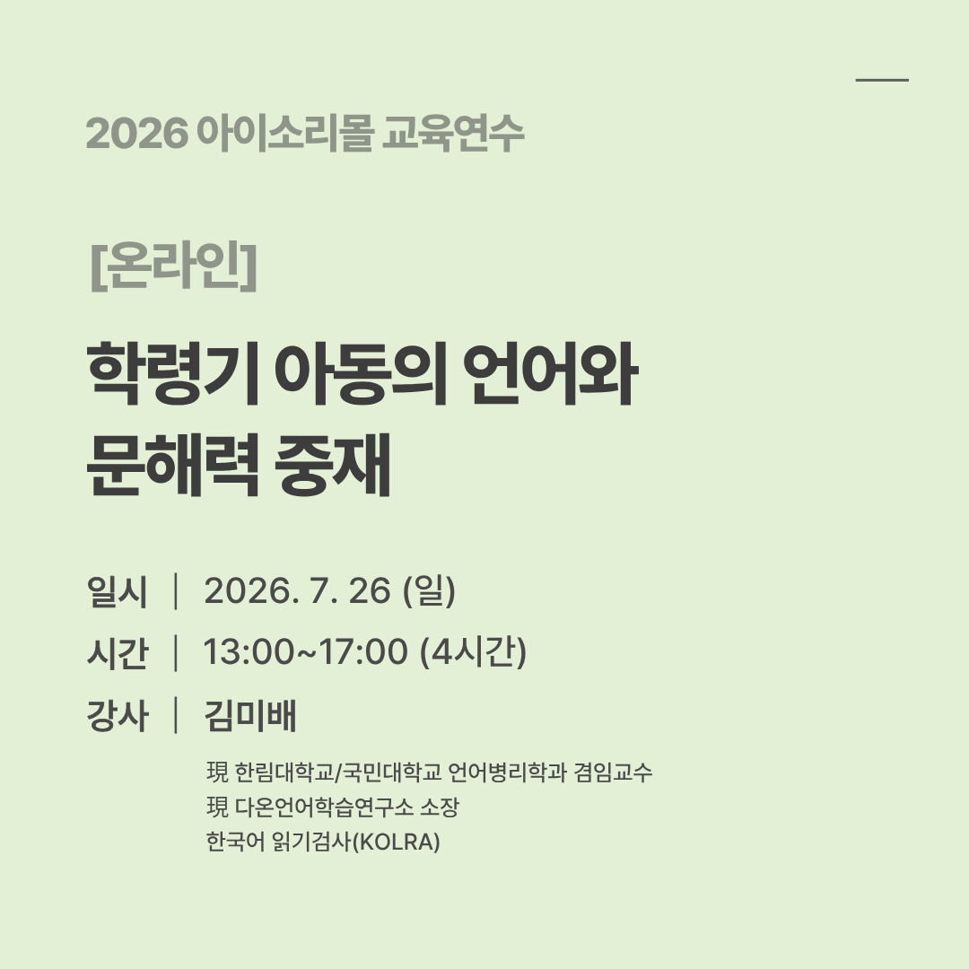 [온라인 ZOOM] 학령기 아동의 언어와 문해력 중재